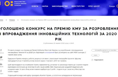Почався конкурс на отримання Премії Кабінету Міністрів України за розроблення і впровадження інноваційних технологій за 2020 рік. Відповідне оголошення було розміщено на сайті МОН сьогодні, 1 червня 2020 року.